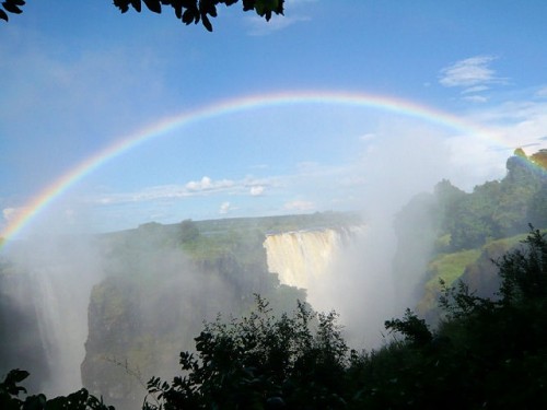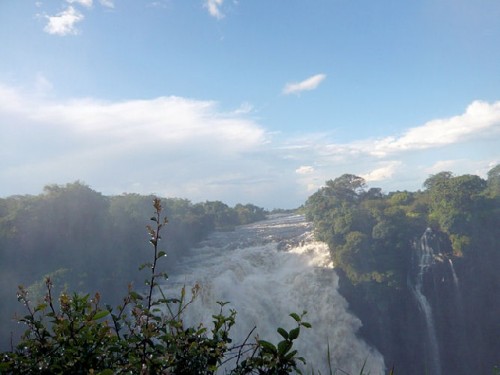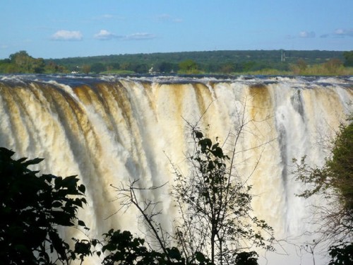 At the Ilala lodge, we were welcomed with passion fruit cocktails. Although still charmed by the shaggy reed roofs of Ilala, having spent two weeks in the bush, I was ready for its swimming pool and manicured grounds. After taking some time to unwind, we left for the actual falls by minivan. We could hear the cascades thunder from a distance, in fact, the falls' African name, Mosi-oa Tunya, means "the smoke that thunders". The Zambezi River, which is straddled by Zimbabwe and Zambia, forms the world's largest curtain of water at the falls. It is as high as the Niagara Falls and one-and-one-half times as wide. At peak flood times 1.4 billion gallons of water per minute pass over its edge.