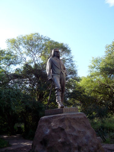 During one of his expeditions Dr. Livingstone came upon the natural wonder of the falls and deemed it to be a scene "gazed upon by the angels in their flight". He made the waterfall famous in the Western world by naming it after Queen Victoria in 1855. There is a bronze statue of him, with a purposeful gaze over the waterfall. He is glorified as a person who inspired by personal sacrifice; he was mauled by a lion and traveled by oxcart for three months to get treatment. He was the first person to use quinine; he lost his wife to malaria. He was committed to ending the slave trade, which became a reality in 1879, five years after his death. Dr Livingstone died of malaria and is buried in Westminster Abbey, although it was later discovered in his will that he had wanted to be buried in Zimbabwe. After deliberations following independence, it was decided to leave his statue standing in Zimbabwe and his body resting in Westminster.
