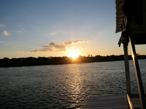 The Sunset cruise was yet another memorable experience. We spotted crocodiles and hippos in the water, lizards on trees and vultures in the air. As soon as somebody in the group exclaimed, "Hippos!" there was a surge toward the rail. "There! There! Black shapes with lots of foam." One of the hippos broke the surface. Cameras clicked away. People took photographs of one another. An island, home to a grove of palm, poked up on the surface of the river. A little cove drifted past, trees growing right to the water's edge. Other cruise boats appeared to witness the sun's changing colors as it magically disappeared into the night sky.