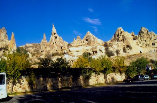 As we approached the Cappadocian Valley, the topography turned into a fantasyland. Volcanic tuff resulting from the eruptions of Mt. Erciyes overlies this region; the colors vary with different eruptions. The "giant sand dunes" exposed to the air have hardened and over time eroded into odd conical forms of gray-yellow rock, many more than 15 meters high. Called Peri Bacalari (Fairy Chimneys) in Turkish, some appear to have off-angle hats. After a quick walkabout we checked into the Perissia Hotel for two nights, leaving the discovery of this open-air museum to the next day.