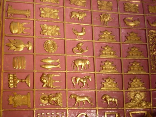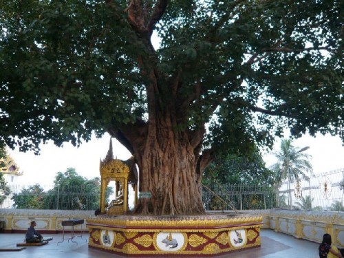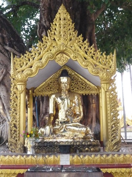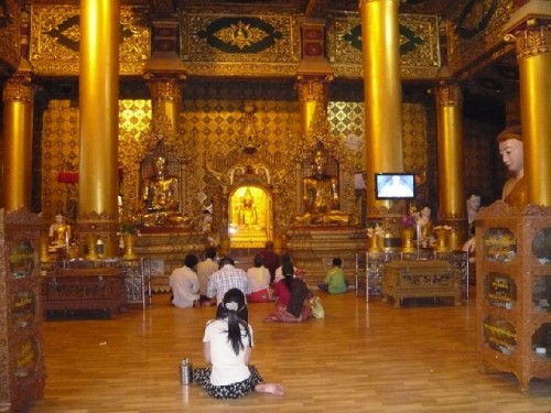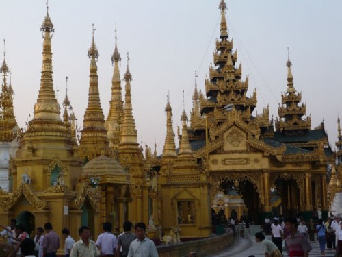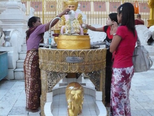 Covered stairways on all four sides of the large complex lead to a marble platform, on which the pagoda stands. Vendors sell devotional objects and souvenirs along these steps. In the middle of the platform stands the main stupa, surrounded by four large and sixty-four smaller stupas. Among the many structures on the platform are shrines flanked by planetary posts, each dedicated to a different day of the week. Here people born on the corresponding days offer their prayers and pour water over the Buddha and the appropriate animal. For instance, people born on a Monday have the tiger as their animal sign and pray by the planetary post for the Moon. From the many pavilions comes a soft murmuring of prayers, while others meditate and make offerings to nat spirits to ask for protection and good fortune. It was at this holy site that the monks began their protest march in September 2007.