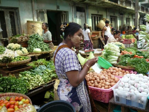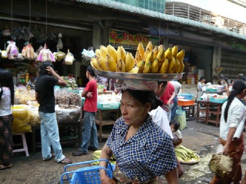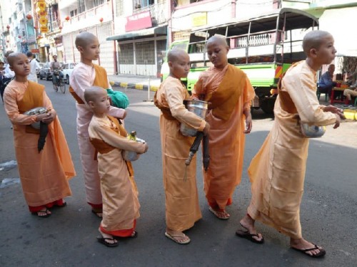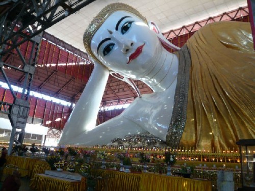 Our tour of Yangon began with a visit to the Chaukhtatgyi Pagoda with its 225-foot-long reclining Buddha, which has 108 distinguishing marks on the soles of its feet. By worshipping these marks, which represent different worlds, believers remember that Buddha is endowed with the attributes of the chief of the world and is the knower of all. Here we observed many monks praying and people using little buckets to water small Buddha statues for purification. The religious majority, representing 89% of the population, are followers of Theravada Buddhism.