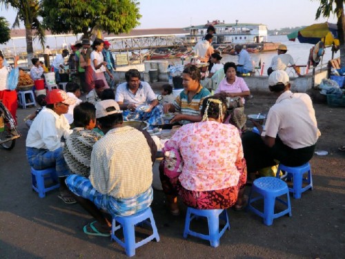 Walking along the waterfront at day's end provided a glimpse into a different aspect of daily life. Commuters crowded into ferryboats to cross the shores of Yangon River, a tributary of the Irrawaddy. Vendors did brisk business as workers crowded around low tables with stools, enjoying food and camaraderie without the intense heat of the day.