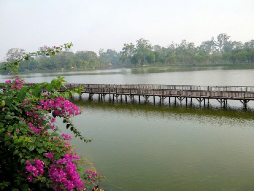 Chinatown with its bustling market was another window onto local culture. With the approach of Chinese New Year, the streets were decorated with lanterns. Nuns in pink robes collected food from the various market stalls, while shoppers mingled among vegetables, fruit, poultry, and baskets of quail, duck and chicken eggs preserved in lime or mud, all considered delicacies, as are fertilized eggs. Men spun thin round sheets of rice dough in the air, flipping them onto hot sheet irons for spring rolls. Some vendors carried their goods on their heads; others spread them out on the sidewalk. Since there is no refrigeration in homes, people shop daily and consume many dried or preserved foods. The array of dried fish in the market was amazing. From very small round eggplants to very large jackfruit with drainable sap, and a cosmetic white powder made from tree bark the market visit offered many discoveries.