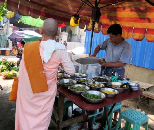 The market visit took us through narrow alleys with small stalls jammed with goods. Myanmar's currency is the kyat, and the official exchange rate is 7 kyat to the US dollar, which commands a much higher rate on the black market. Since the dollar is accepted everywhere, I did not have to change money. I bought a T-shirt imprinted with the Burmese alphabet, which has thirty-two letters. Burmese is the principal language of 70% of the population, whose origins are in the Gobi Desert in Mongolia, with an additional 135 officially recognized ethnic groups. Burmese belongs to the Tibeto-Burman language family, though many Burmese words derive from Sanskrit, an Indo-European language.