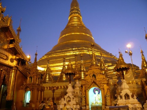 The Shwedagon Pagoda is the cultural and spiritual heart not only of Yangon, but of the whole country. Believed to house relics of Buddha, including four strands of hair, the sacred site attracts pilgrims, who come to venerate Buddha and to meditate. The shining golden beauty of the pagoda is simply enchanting. Traditionally gilded since the 15th century, it is decorated even today with gold leaf laid by pilgrims. An estimated 100 tons of gold adorn the pagoda, which rises 322 feet above its base. The lower parts are covered in gold leaf, the upper parts in gold plate.