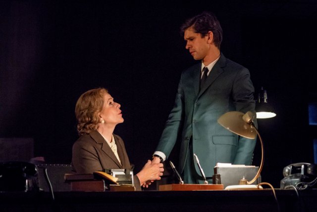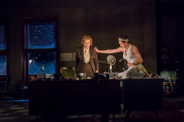 Ben Whishaw is a wonderful actor, dictating at first with all the punctuation articulated. You can almost see the words being typed as he speaks. His struggle with the project is palpable. The pictures that are going up on his work bulletin board are of Monroe. They guide him even though Helen remains present in the typewriter and her daughter Hermione, for whom she yearns, is an invisible onstage presence.