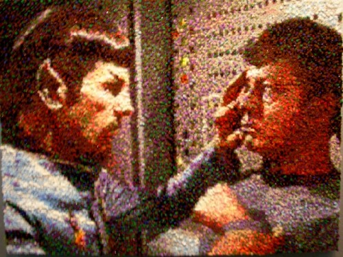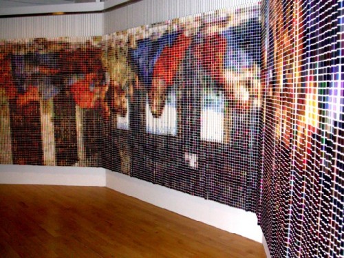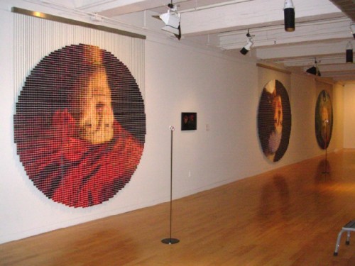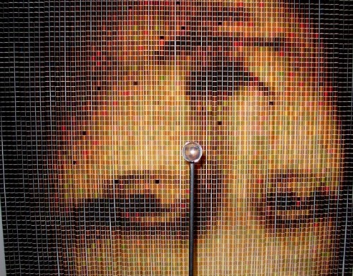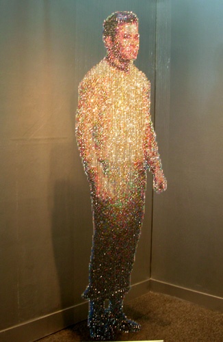 The artist seemed surprised when I asked if she were currently showing at Mass MoCA. "The show only opened last week" she said and asked if I had seen it. Actually, not at the time. But the technique of making reproductions of iconic images with "pixels" meticulously assembled through multi colored, beaded curtains and grids of spools of thread is so unique that I proved to be on target. For Pulse she was showing several beaded curtains based on the Science Fiction series "Star Trek." It was eerie how precisely she replicated the process of Dr. Spock, Captain Kirk, and others being teleported from a planet's surface to the Starship Enterprise. The phrase "Beam me up Scottie" is etched into the subconscious of a generation of fans. Of course, the camp actor, William Shatner, now far more rotund and deranged, portrays the entertaining and total gonzo, Denny Crane, a lovable attorney who suffers from Mad Cow Disease on "Boston Legal."
