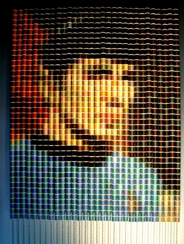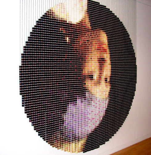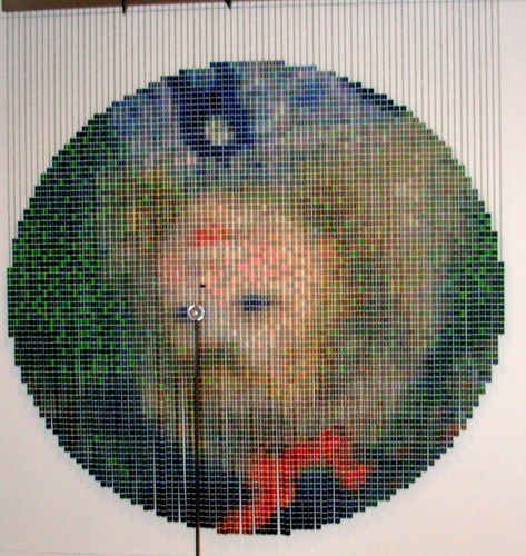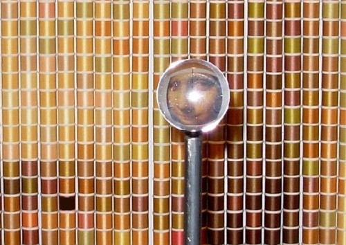 If we stand close to Sperber's works we are acutely aware of the elements; endless spools of thread. In the case of her "Mona Lisa" some 5,184 thread spools to be precise. Another aspect of the work is that the assemblage, or relief sculpture, is suspended upside down. In front of the piece is a small clear sphere. If we examine it through this device we find the "painting" inverted and quite legible as the "Mona Lisa."