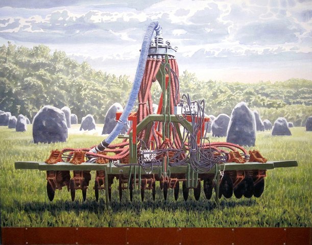 Another work “Belgian Seeder at Rock Field” seems almost possible. The large farm apparatus is elaborately rendered. But hold on a minute it is set before what appear to be an arrangement of Neolithic monoliths with the scale and shape of unmarked grave stones.
