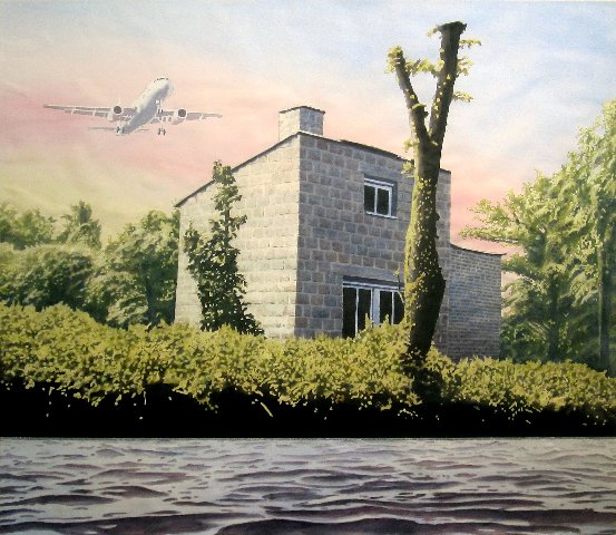 In “Under the Radar” a commercial jet plane appears to be approaching a landing over a long horizontal shed. There is seemingly no reason to question its verisimilitude other than the context of the artist’s oeuvre.