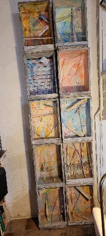 Greg: Problem-solving. That’s what we did. That is what we were always doing. I remember it being a few hours of panic, but the fix worked. The show looked great. And you have forgotten a further highlight of the show. Along with the 18 large paintings, you also exhibited ten amazing wooden box sculptures—ten wood boxes (I remember them looking like crates that whisky bottles or upscale wine had been packed in), each uniquely painted and containing sculptures or collages of rags, paint, wood, and wire. I referred to them as mini ateliers, but they could equally have been seen as abstract set designs or studies for One Day in May. That whole UNESCO show resonated with so many of the remarkable materials and images and ideas that grew out of the Chez Haynes years: the photos, the rags, the x-rays, the ateliers, the portraits, the exploration of self.