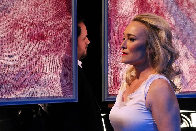 Each opera in the program is well-staged – an ornate drawing room for “Il Segreto,” and hanging artistic panels as backdrop for “Four Dialogues” and “The Husbands,” but with distinguishing props. Placement and movement are thoughtful throughout. One (Ingmar) Bergmanesque symbolic moment of note appears in the dissolution scene of “Four Dialogues” with a close up of the couple in profile, facing as if toward each other but actually in different planes and looking past each other. The lighting in “The Husbands” is particularly absorbing, playing on the autumn red tree leaves in the outdoor scene and isolating the characters from the world around them.