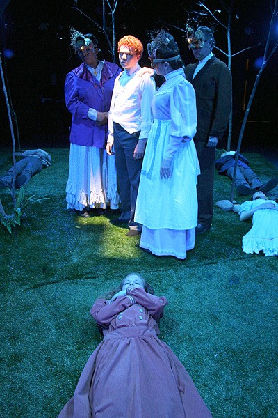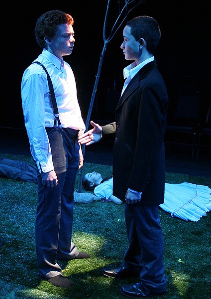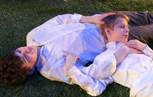 So how did Zeitgeist's gamble work? The cast Miller chose is mostly up to the task, remembering their lines and stage directions with few stumbles, and audiences can look forward to many moments of theatrical incandescence. Of the twelve teens, Carlos Rojas, as Moritz, is an absolute standout, as is his pal, Melchior, well played by Paul McCallion. Rebecca Stevens is very affecting as Wendla, though, like many of the players, is occasionally hard to hear. Of all the actors, Rojas has the best opportunity to layer his performance; especially in the final graveyard scene where he probes deeply into the mind and spirit of the departed Moritz. As Melchior, McCallion is a suitably reluctant participant in the S & M scene with Wendla, though Rebecca Stevens will need to work on her lower vocal register to sound more assertive and dominatrix-like.