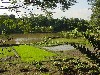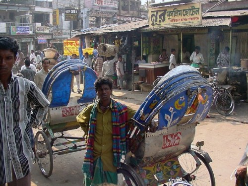 Curious, my wife Sarah went out to the gate and found a small graying man with a warm smile. Mr. Nasam greeted her in quite fluent English, saying our friends Dee and Victoria had sent him to us. Mr. Nasam is a very enthusiastic bookseller, whose clients are expatriates living on the outskirts of Dhaka. He proudly announced that he had come to show us his book collection. He arrived on a bicycle rickshaw, peddled by another thin graying man, one of the tens of thousands of poor rural men who carry people and goods around the city for ten hours or more every day. The rickshaw body was covered with fantasy paintings of tigers, rivers, and Indian movie poster scenes. The passenger seat was piled up over three feet high with boxes of books, and on top of this mountain of book boxes, Mr. Nasam sat, soaked thoroughly by the rains. The driver, or wallah, was wrapped in an old shawl to keep the rain off his face and wore only a long plaid longi cloth around his hips.