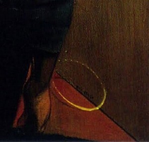 The heresy in this work can be seen at many different levels. The always staid and patient Mary has given in to her human emotions, venting her anger at the now humanized child, for some act of insubordination (original sin?). The child, corpulent and squirming, has his face turned away, as though to preserve dignity, although his pure nakedness belies the modesty usually attending representations of his often nearly-stripped body. The fallen halo, lost in the fracas, has tumbled to the ground. Ernst has quite nonchalantly painted his signature on the halo, relegating himself to the role of “X, Y or Z” in Baudelaire’s earlier story—symbolically placing it upon his own head in an “act of impudence…[and] humor.” Once again, the sacred is rendered profane in an act designed to rebuke the past.