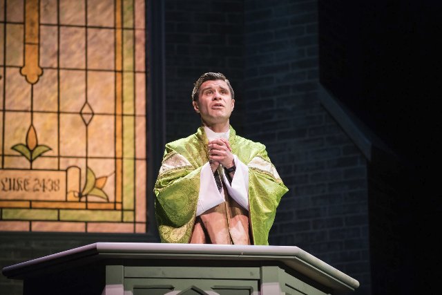 The production is played out on a large set that incorporates aspects of several locations. These include: the church pulpit (framed by a gorgeous stained-glass window), a principal’s office, and an outdoor courtyard. By lighting different areas of the set during individual scenes, it allows the play’s tension to remain intact throughout. Credit for this effect goes to set designer Steve Barnes, assisted by lighting designer David Gipson.