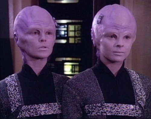 Meanwhile the various dual-sets of artists in The Believers, with their assumed personae and surgical transfigurations, are not at all original. They were trumped by Star Trek: The Next Generation, such as Episode 16 "11001001" (from 1987). The show introduced Bynars, who are a cyborg race of cute, lilac-colored space aliens who although pairs are linked as one functional unit. In fact Star Trek includes a much more wide-ranging play with individuality and identity: transporter accidents where separate characters merge into one new hybrid; the surgically-altered, evil Borg collective; artificially intelligent computers and robots who may or may not be alive, etc. Who's to say that the future won't bring cyborgs, clones, symbiotic pairs, split personalities, or self-designable surgeries? For the most part The Believers can't stand up to popular visual culture which is technically more complex, much more richly aesthetic, better to look at, and often a lot more fun.