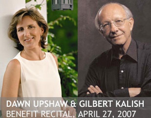 Upshaw and Kalish will perform a selection of personal favorites, including Stephen Foster's "Beautiful Child of Song"; Ruth Crawford Seeger's "White Moon," from Five Songs; Charles Ives's "Two little flowers (and dedicated to them)"; Gabriel Fauré's "L'aube blanche," from La chanson d'Eve; Claude Debussy's "La Flûte de Pan" and "La chevelure," from Chansons de Bilitis; Maurice Ravel's "Le cygne"; Olivier Messiaen's "Le collier" and "Prière exaucée," from Poèmes pour Mi; Robert Schumann's "Er ist's!", and "Mignon" (Kennst du das Land?); Hugo Wolf's "Die Bekehrte," from Goethe-Lieder; Alban Berg's "Die Nachtigall," from Sieben Frühe Lieder; Kurt Weill's "Je ne t'aime pas"; William Bolcom's "Song of Black Max," "Waitin'," and "Amor," from Cabaret Songs. Mr. Kalish will perform Charles Ives's Piano Sonata, No. 2, "Concord, Mass., The Alcotts," and a work by Johannes Brahms.