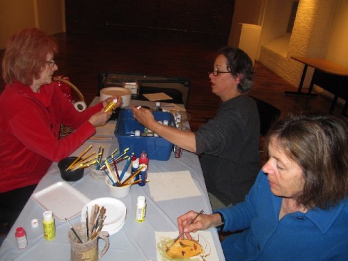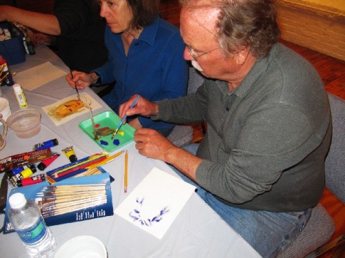As we soon found out individuals with varying degrees of skills were gathered around the table. Paper plates were used as palettes with a range of primary colors as well as white and black. Student grade brushes were passed around as we experimented on paper.
