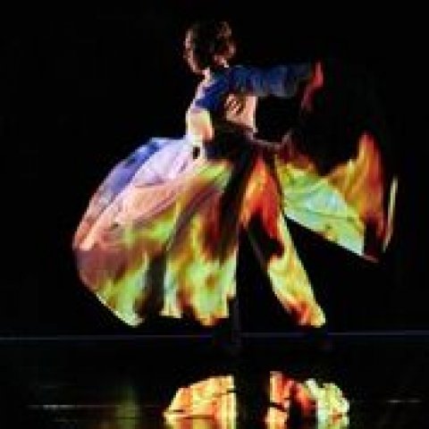 Images of the artist's line and colors were projected onto her always white costume, which reduced from blossoming white to a shirt and pants. The story begins with the death of Hilma's beloved sister. Across the globe at the end of the 19th century, distinguished persons were consulting ouiga boards to contact people in an alternative universe. Like philosopher and Harvard professor William James in this country, Hilma contacted her sister through a medium. In exchange, the medium guided Hilma's hands to create her now famous temple paintings. Ten of them are on display as you step onto the upward ramp of the Guggenheim. Frank Lloyd Wright's Museum is also a temple of sorts.