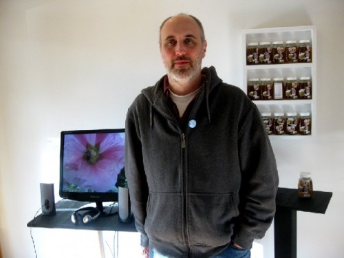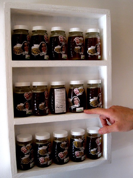 David Lachman, who works with video, started keeping bees last summer. He started with two hives. he has created a limted edition. The labels depict Marianne as the Queen Bee and Matt as a drone. They are selling for $20 each which is a lot for honey but inexpensive for works of art.