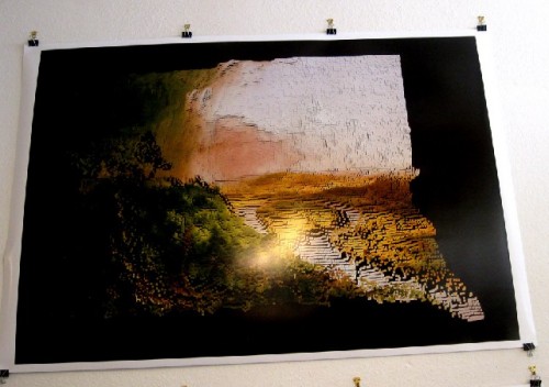 We talked with Jeremy Rotzstein who is displaying two, large, computer generated digital prints of altered nature.