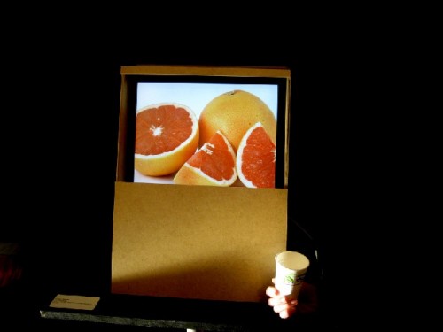 We were intrigued by the scratch and sniff project of Alex Kaufmnann. There are rotating images. When the grapefruit is displayed, for example, you rub the screen and then lean in to sniff.