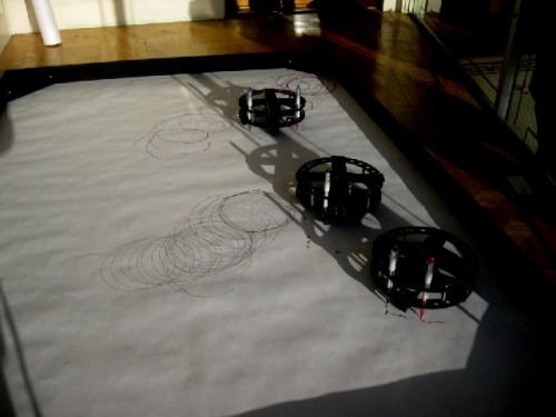 The drawing devices in the window by Christian Cerrito are activated by solar energy. Since the sun was setting they slowed to a halt. To demonstrate he used a bright light to get them going.