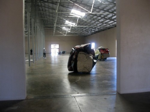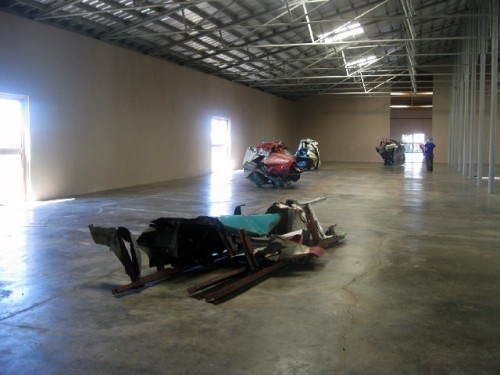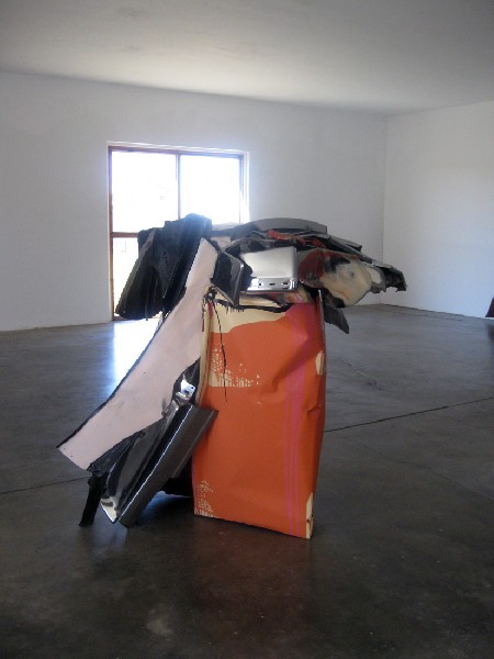 Down town they were placed into and crushed by a bailing machine. No longer boxes the mangled objects were more difficult to fit into the van. Back in John’s studio he spot welded them to create new works.