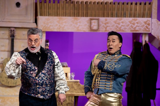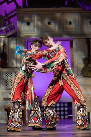 In the operatic manner, this play is sung-through, though there is a fair bit of talk-sing and lyrics that are asymmetric to the music. The music is appealing throughout and highly gemischt, in keeping with the quick changes of mood and players as the scenes whiz by. To give a period feel, there is plenty of mournful Slavic/gypsy/klezmer influence, led by wailing woodwinds and accordions. But contemporary genres dominate, with the composer drawing on indie rock, Broadway, and even bluesy forms. The score mostly invigorates and brightens the tone, including some spontaneous clap-along, but the house was conspicuously hushed for the sensitive and lovely duet by the title characters at the climax.