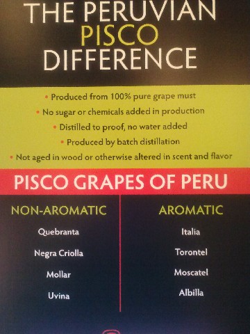 Today, Pisco, is made in designated regions from a variety of approved grapes that are fermented and turned into a wine with high alcohol like Brandy.