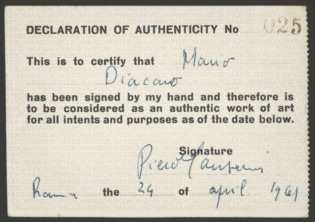 MD Oh yeah, I had met him at an opening in Italy. Before I met him, I had written an essay for a new magazine in Milan, in 1961. It was an essay on White in Contemporary Paintings, and it was about Fontana, Manzoni and Twombly. The new magazine never came out, and my essay was lost. So I met Manzoni at the opening of a show in Rome, and told him I had written this essay. He took out his sort of a check book, and wrote me the certificate of being a living art work.