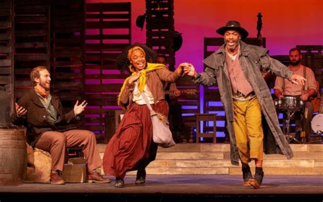 Marcus Abbott has created a multi-tiered set that is easily transformed from an Irish cottage to slave quarters, to caves for hiding and more. He also designed the effective lighting.