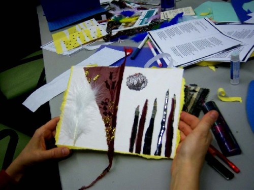 The group’s main exercise was to reuse material for book making and quickly, some colorful and delightful book covers were produced around the tables. Falconi and staff asked further questions about the poem’s content, in order to penetrate or individually own its meaning, and suggested group interactions and expressions. What an inspiring workshop!