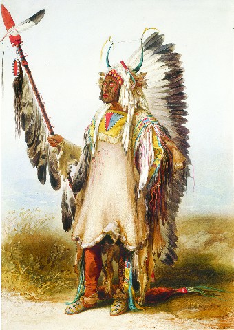 Among Bodmer’s notable portraits is that of Mató-Tópe (Four Bears), painted at Fort Clark, North Dakota, during the winter of 1833–34. Mató-Tópe was a highly respected military and religious leader among the Mandan. Bodmer shows the chief formally attired in a shirt of bighorn sheepskin elaborately trimmed with ermine tails, locks of hair, and strips of quillwork outlined in beads. Mató-Tópe’s headdress, with its long trailer of eagle feathers, probably signified the combined battle coups of a war party or men’s warrior society. The lance in his right hand was said to have been used to kill an Arikara who had murdered the chief’s brother, its shaft afterward decorated with the enemy’s scalp stretched on a hoop.