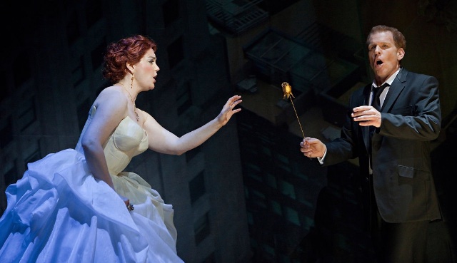 Strauss thought that ancient Greek myths were a good way to present contemporary problems. Other creative artists have married the myths of Midas and Jupiter as he did. Much of the confusion of who is whom in Danae, for instance Midas is Jupiter’s messenger and stand-in, are cleared up in Kevin Newbury’s direction, a not easy task. Cityscapes abound in projections, multiple portraits of the beautiful Danae, and finally her mature choice of love over money is presented on stage with visual delight and surprise by Rafael Vinoly and Mim Lien.