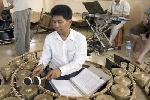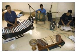 Some accommodations of Eastern instruments to Western standards harmonized cultural exchanges. Lilting, airborne cadences from traditional Cambodian instruments - gongs, bamboo flutes, long-neck lutes naturally floated in and out of sync with rock's electric instruments. To create a fuller sound akin to rock, the Angor-era xylophone or roneat pluah was altered by adding a second set of wooden bars and by using four mallets instead of two. In the Cambodian Daily, Suzy Khimm wrote "Even cell phone ring tones have a place in the score—the villain answers his phone to a reincarnated tune of a Khmer Rouge propaganda song".