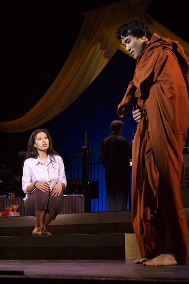 The staging included a temple's golden contours drawn in draped fabric and two elevated platforms that contained a Khmer rock band, traveling from Cambodia, a traditional Khmer orchestra, and a string quartet from the New England Orchestra. Lighting set the mood and unified disparate elements that underscored the need for harmony.