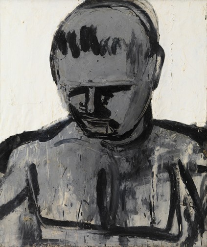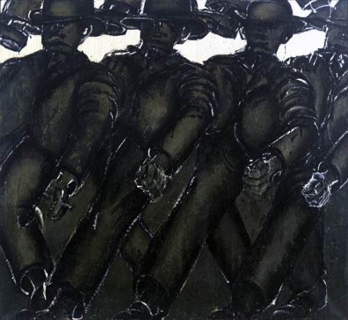 Lester Johnson could be considered asking the same questions as a phenomenologist trying to describe the shape of what it means to be human. However, being part of the group is not an unquestioned given as it was for the pop artist. The line up of generic men in Johnson’s work is often scary. They are reminiscent of the living dead that pour out of the Underground in T.S Eliot’s London. They are unsmiling and unaware of the condition that defines their identity with the group, carried along by some mass hysteria.