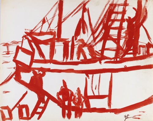 One drawing in the show at Acme that I took great pleasure in looking at was an ink brush drawing of a view through a window of the ocean in Provincetown from the fifties. The space depicted starting from a table and chairs in front of him, to the window frame, then the porch and finally the boats on the water are all rendered by the same black unmodulated stroke. The space is compressed and all the things are simply depicted. My first thought on looking at it, was that this guy is visually astute. He can draw.