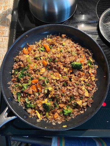I had some leftover pork ribs which I combined with carrots, broccoli, celery and frozen peas, about 2cups of cooked rice, ginger, garlic powder and soy sauce.