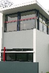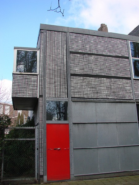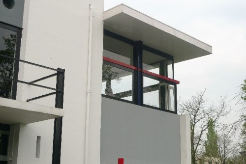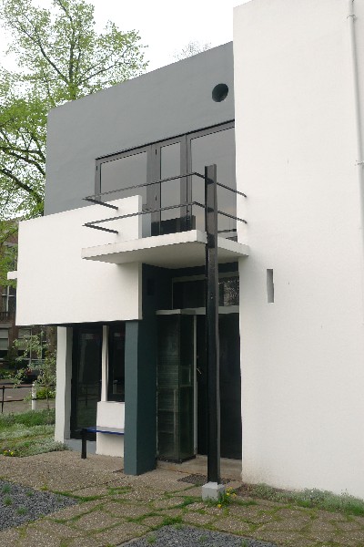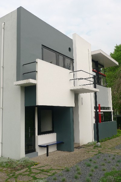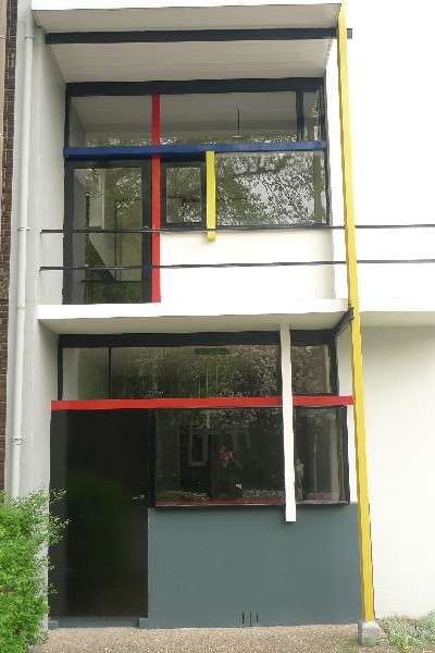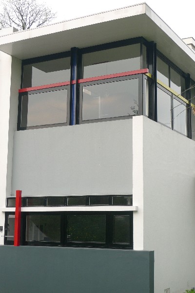 The exterior of the house is rectilinear and asymmetrical like all of the De Stijl paintings. The severe 90 degree angles were apparently dictated by Mrs. Schroeder. She was interested in living in a completely modern structure. The railing design on the balcony is an example of the total rather wonderfully severe aesthetic. Overall, there is a special spare elegance to the buildings elements individually and as a whole. The facade is made out of a plaster over board and steel or iron structures. This construction predated cost-effective pre-cast concrete fabrication methods. Black and white as well as gray are the dominant colors with very occasional poetic touches of red, blue or yellow primary colors.