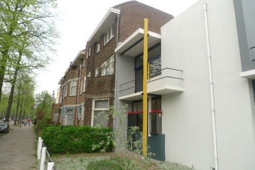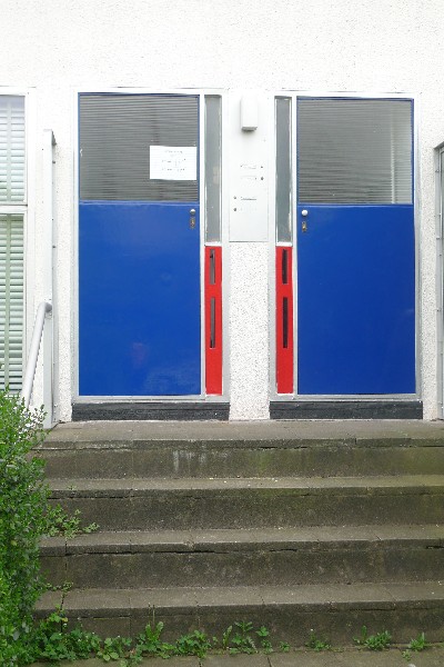 In 1928, Rietveld broke with the De Stijl Movement and switched to the Congres Internationaux D'Architecture Moderne taking a more Bauhaus, less polemically rigid approach to his work. Perhaps it was something about diagonal lines? In the late '20s, he went on to design two Bauhaus style buildings now located across the expressway from the Schroeder House. This was on land owned by Mrs. Schroeder and was part of the trend in social housing. These terrace house structures are still being lived in today, and one is shown on the Rietveld-Schroeder tour. Here, primary colors are used as visual emphasis on entrance doors.