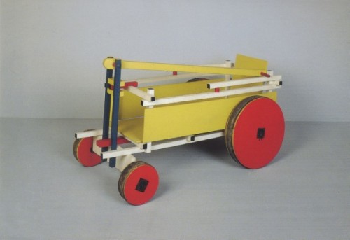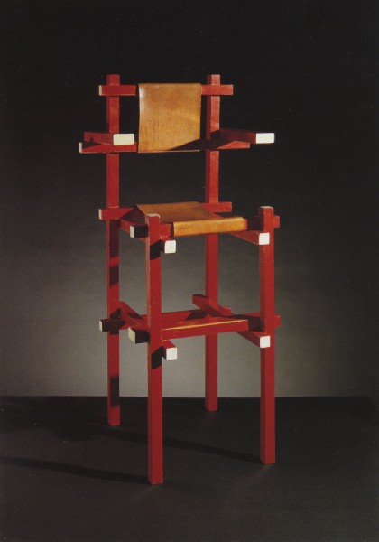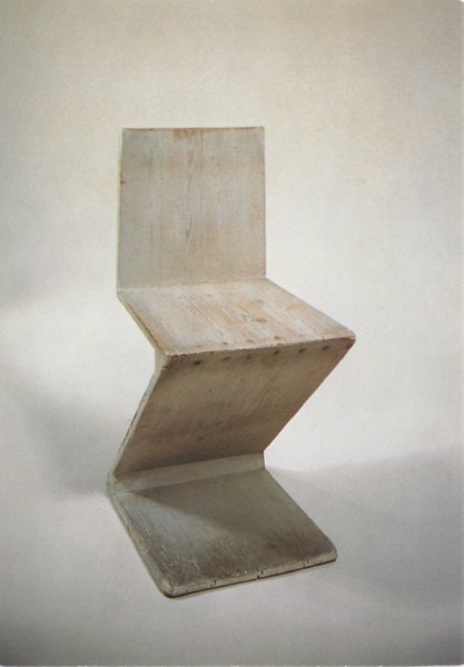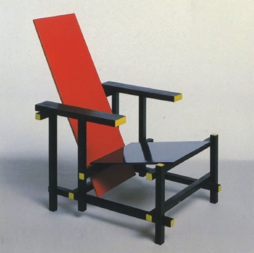 His classic Red and Blue geometrically elegant and spare chair was created in 1917. Influenced by the Dutch group De Stijl, he changed the colors to all three primaries and black in 1918. De Stijl or The Style in English was also known as neoplasticism and refers to a body of work from 1917 to 1931. Most prominent among its members were painters Piet Mondrian, Vimoz Huszar and Bart van der Leck and architects Robert van 't Hoff and J.J. P. Oud. It was also the name of a journal published by the Dutch painter/designer/critic Theo van Doesburg (1883-1931) which expounded upon the group's theories. It was founded in 1917. Rietveld became a member of the group in 1919. This was the same year that he became a professional architect.