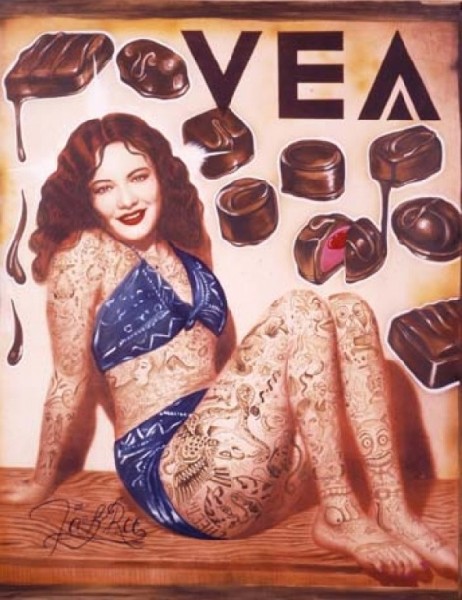 Dr. Lakra is an anthropological illustrator rendering cultural references and symbolism to the "skin" of archival images from photos, magazines, advertising, Kewpie dolls and photomontages. Of their generation, his creative work is another form of street art in a different but similarly strong statement way that the works of Banksy, Shepherd Fairey, Space Invader and Ron English are expressive and personal while touching universal chords. It is muy macho with a bit of wit while being an art that has a salsa caliente of sensibility. However, there is also a creepiness that pervades much of it, the rot of roadkill, the underbelly of life exposed and the almost magnetic fascination of a zombie horror film. The Day of the Dead (Dia de los Meurtos) seems to be celebrated each day in his artwork. Yet, it functions visually, culturally and sometimes brilliantly. His art may not be as exterior-sited as the other prominent contemporary street artists, but Dr. Lakra's often dark inner landscapes are as poignant, graphic and visually provoking as their best works.