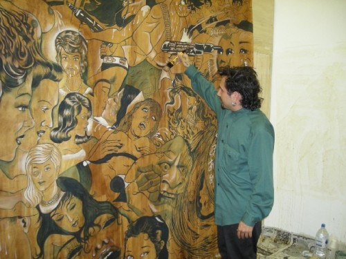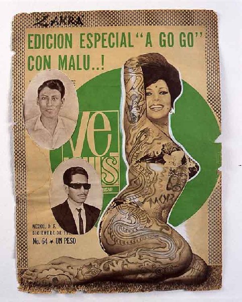 Dr. Lakra has traveled from California to Thailand to the Philippines to work with artists still practicing traditional tattooing techniques. His irreverent works explore the tensions between social structures and innate desires, the group and the individual, sacred and secular. Juxtapositions of sex and death, old and new abound, as grotesque creatures encircle seductive women and society figures bear the symbols of fierce modern-day gangs. According to the curators, even the artist’s pseudonym, inspired by his habit of carrying tattoo equipment in a black doctor’s bag, is a clash of opposites: lakra, a Spanish colloquialism meaning “delinquent,” follows a title that commands respect.