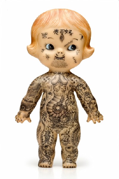 No surface escapes the artist’s pen—everything from vintage magazines and Japanese prints to plastic cups and Kewpie dolls are covered with his provocative and macabre drawings. The work combines a diverse range of patterns and symbols—such as Chicano, Maori, Thai and ancient Aztec imagery—with pop culture and erotica to create a tantalizing mix of life, death and desire.