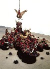 An entire section of the exhibition will be dedicated to Coyne's seldom exhibited photography - enchanting explorations of movement and tone. Upon first glance they seem to be black and white but just as the colors of flowers emerge from the black wax works, here subtle shades poke through these blurred figures of children, Buddhist monks, and brides. Unlike many contemporary artists who focus on social or media-related issues, Petah Coyne imbues her work with a magical quality to evoke intensely personal associations. Her sculptures convey an inherent tension between vulnerability and aggression, innocence and seduction, beauty and decadence, and, ultimately, life and death. Coyne's work seems Victorian in its combination of an overloaded refinement with a distinctly decadent and morbid undercurrent. Her innovative use of materials includes dead fish, mud, sticks, black sand, shredded car parts, wax, satin ribbons, artificial flowers and birds, birdcages, taxidermy animals, Madonna statues, and horsehair.