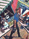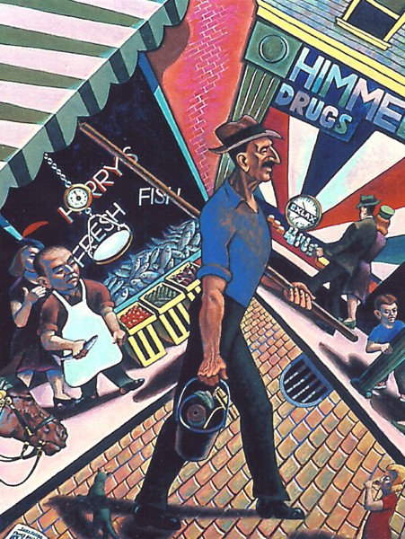 The full length portrait is set geometrically against a streetscape of cobblestones, shops and people. By the way it is painted, it appears to have forward motion. The streetscape is expressionistically organized into a whirlygig or pinwheel of potential action and spin. Content supercedes composition in all of Trachtman's paintings.